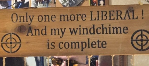 The photo was apparently taken last weekend – the same weekend of the club’s winter tournament – at Tinman’s Pub, located at 926 Route 22, right off of Ski Hill Road. The sign reads, a photo of which has circulated on multiple social media sites, reads: “Only one more liberal, and my windchime is complete.” The wooden sign includes shapes resembling rifle scope targets and bullet casings dangling from it.